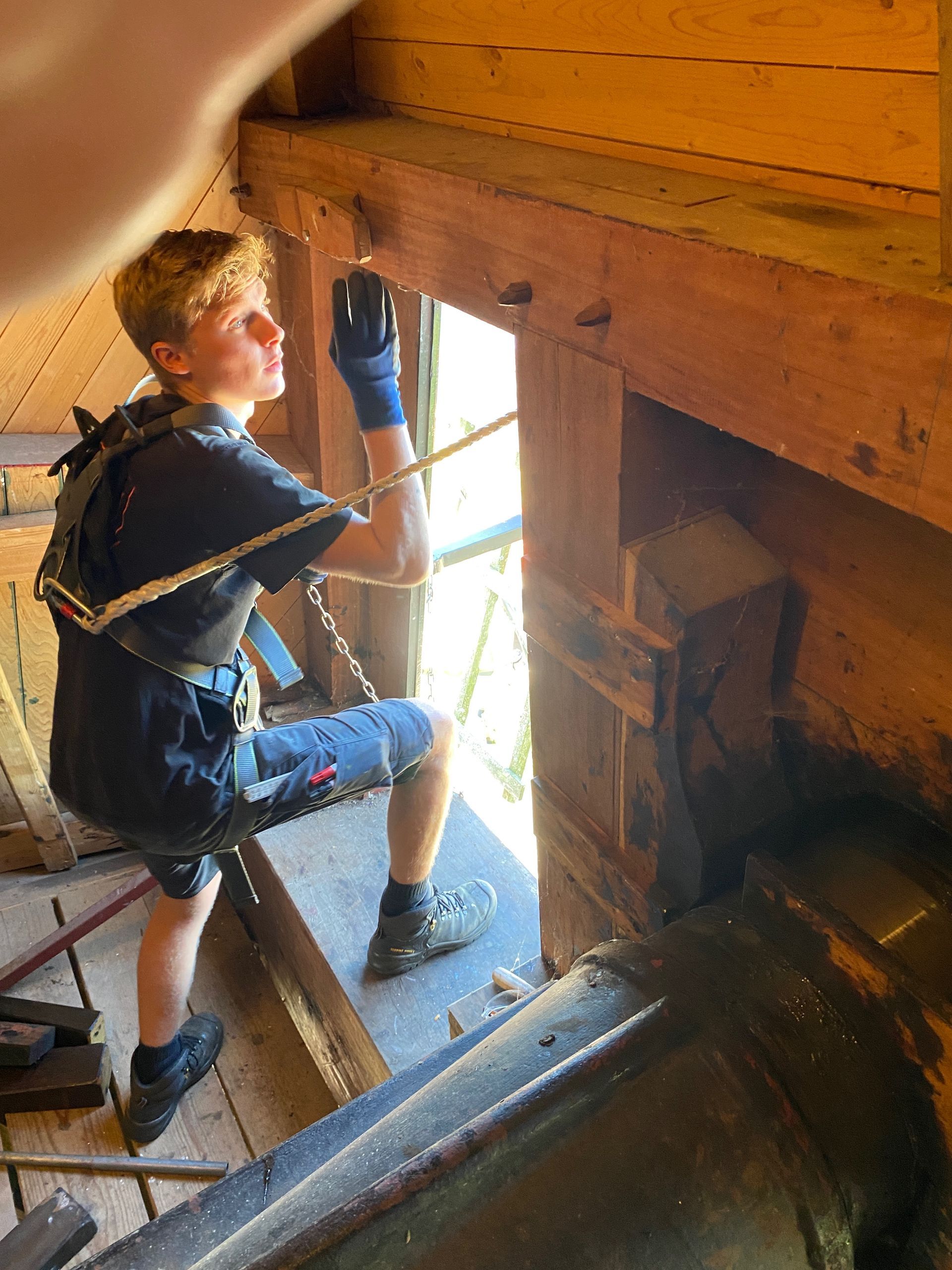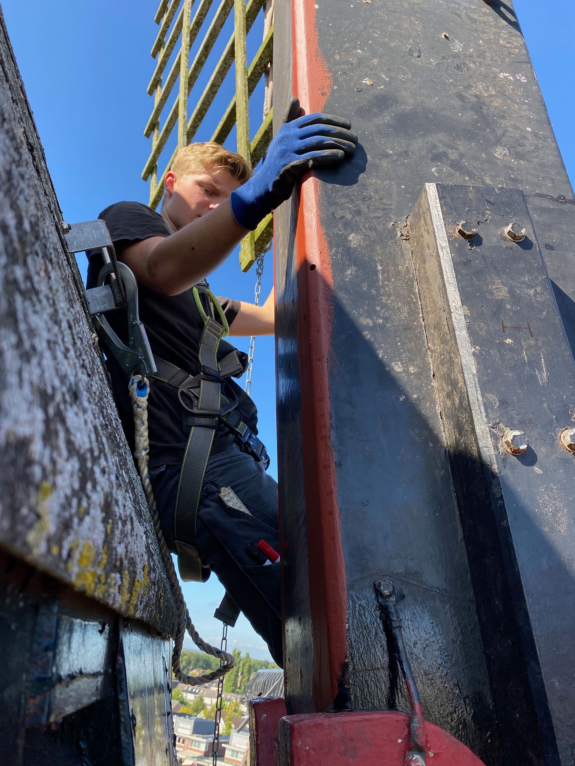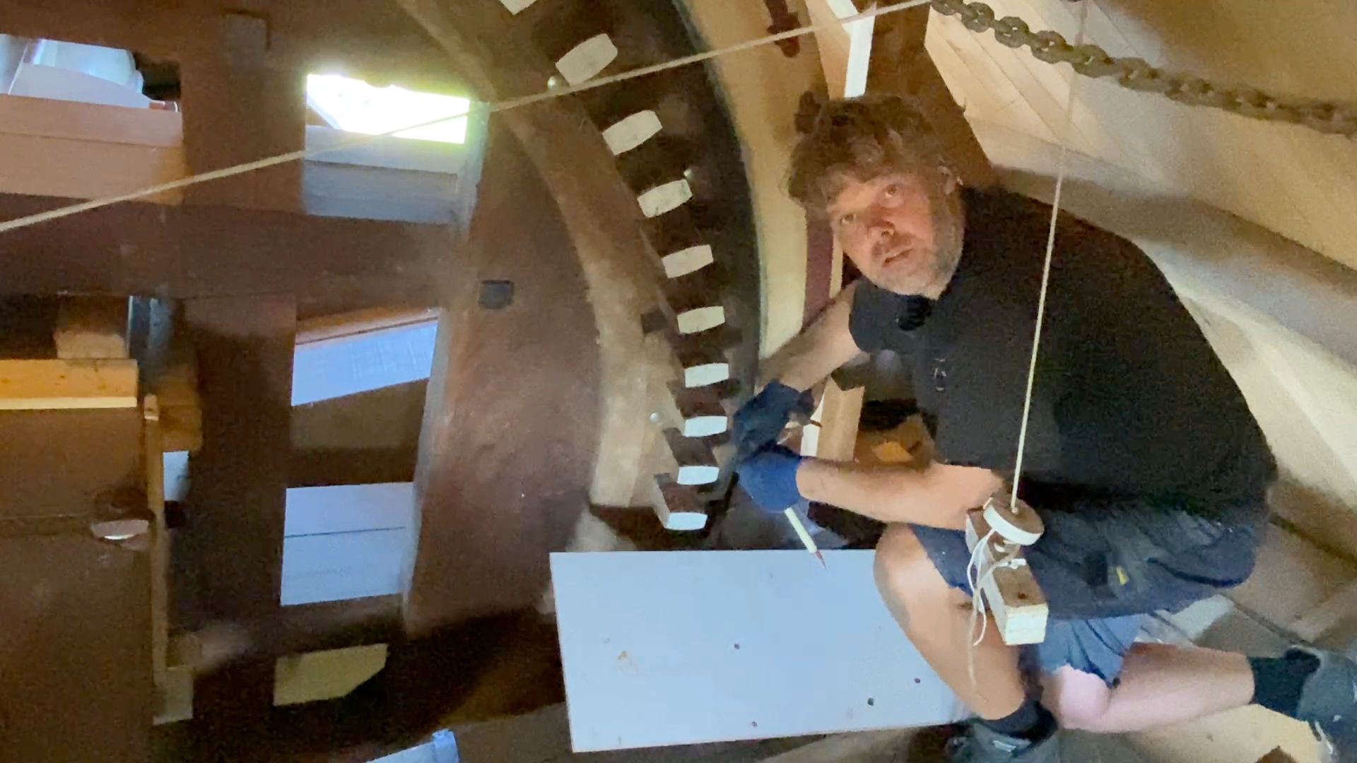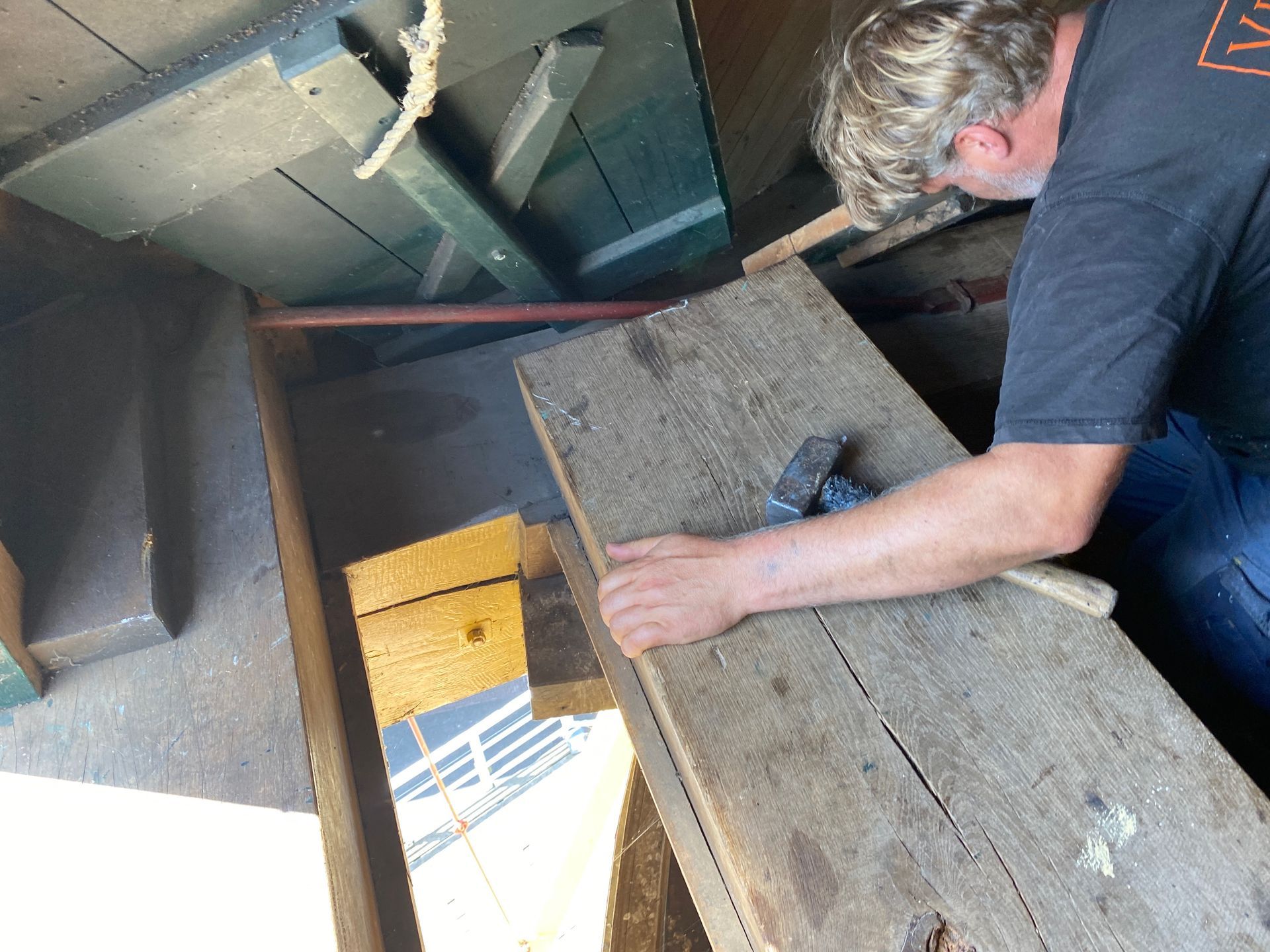 Every 10 years the blades (rods) must be "pulled out", i.e. the rod must be pulled slightly out of the axle head in order to check the part within the axle head. The millwright inspects for defects such as corrosion and cracks. Fortunately everything was fine. There was also a lot of work to be done inside the hood, the top axle was "tamped up" by about 2.5 cm because it had sunk. The top wheel had a crank, this has also been resolved. And some further adjustment work.