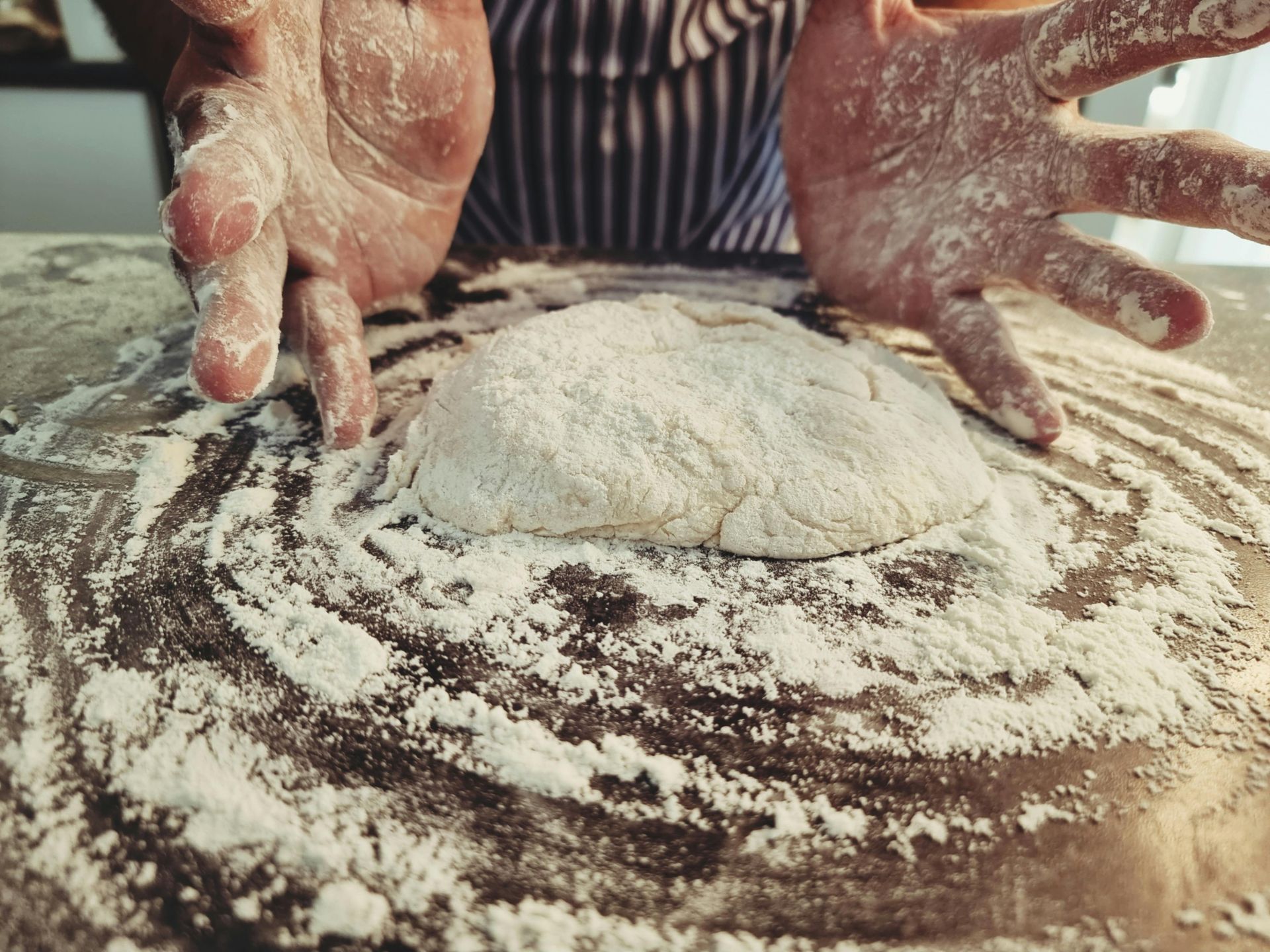 - Druk het deeg uit tot een ronde schijf met een oppervlakte van 2 vlakke handen