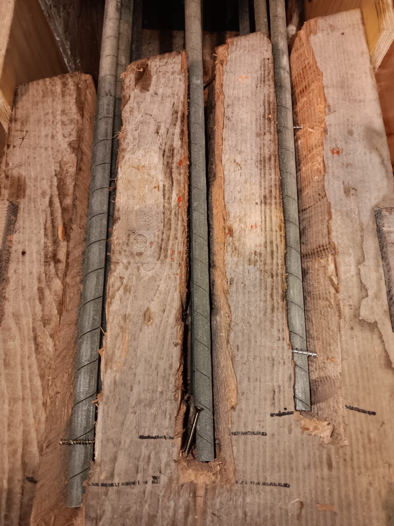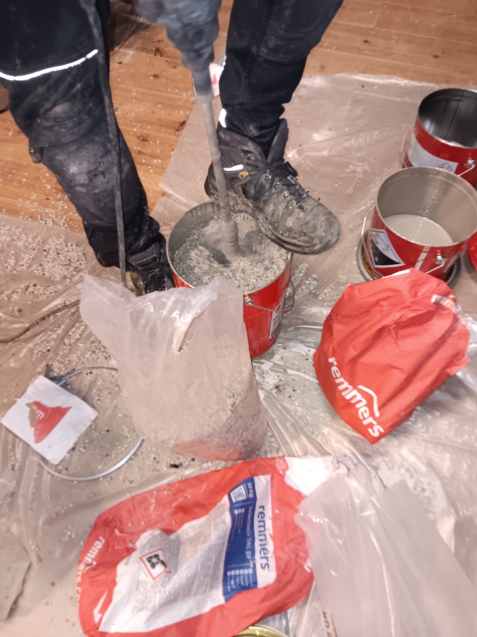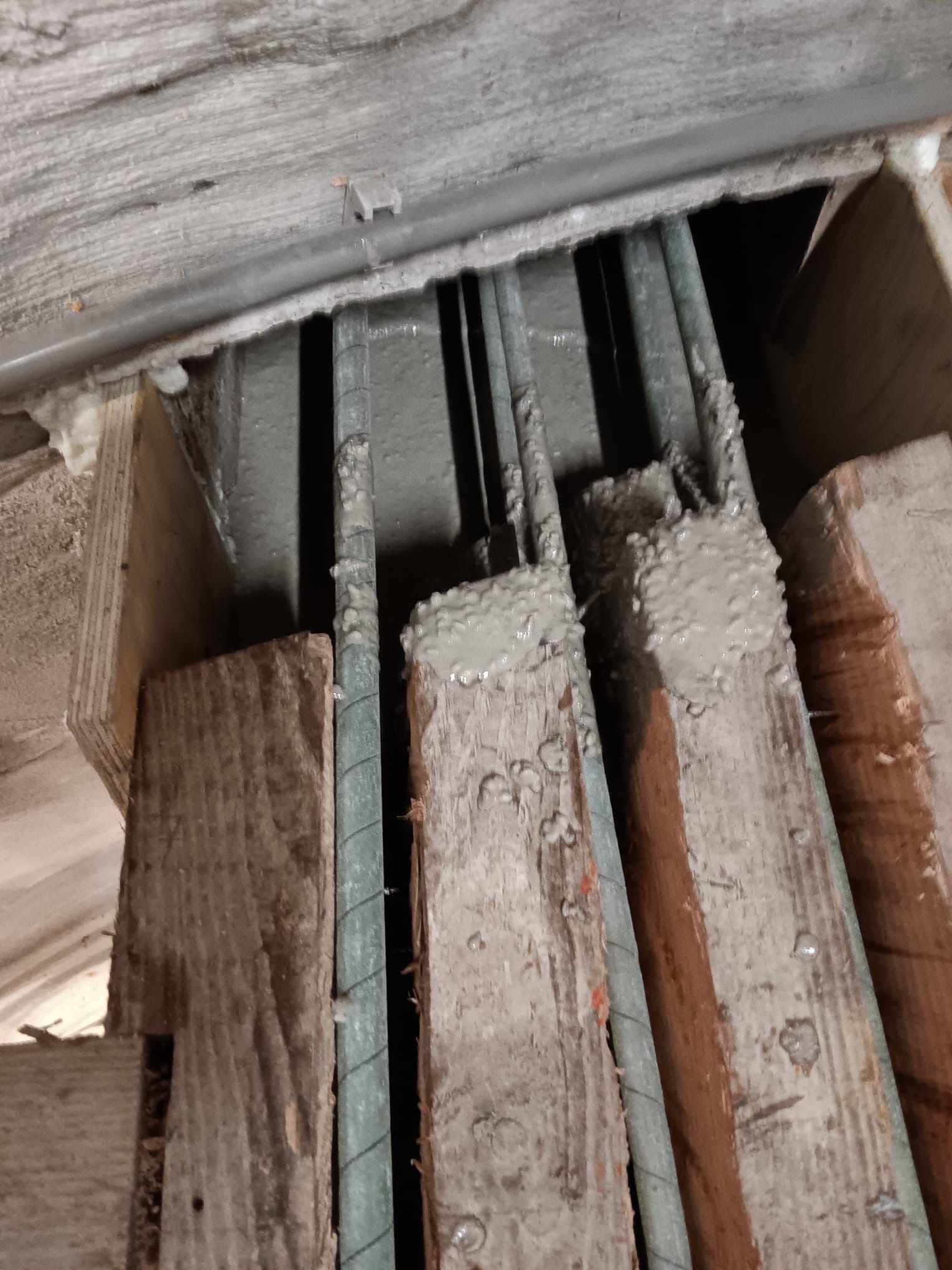De foto's geven het proces weer. Essentieel is het verwijderen van het aangetaste gedeelte, te zien op foto's 2 en 3. Daarna het frezen van de sleuven waarin de fiberglas-staven komen te liggen. Na het plaatsen van 9 staven wordt het defect laagsgewijs opgevuld met epoxy. Om te voorkomen dat de epoxy wegloopt wordt er een bekisting gemaakt. Na 7 dagen kunnen de bekisting en de stempels worden verwijderd. De balk is zo de komende decennia gevrijwaard van aantasting.