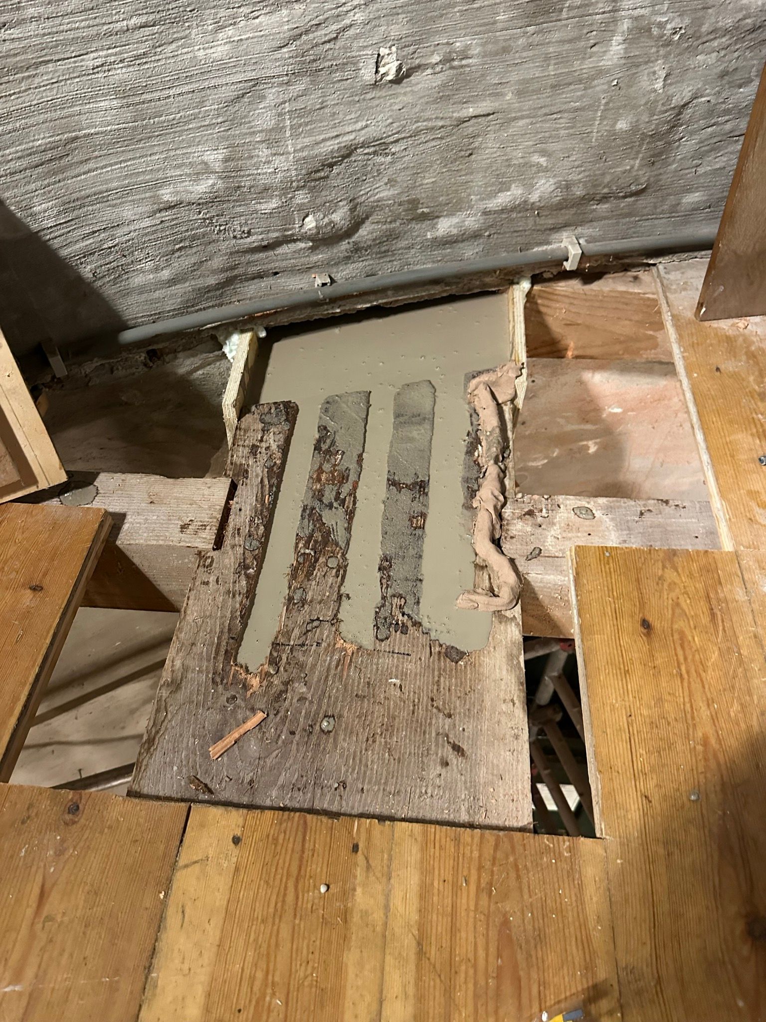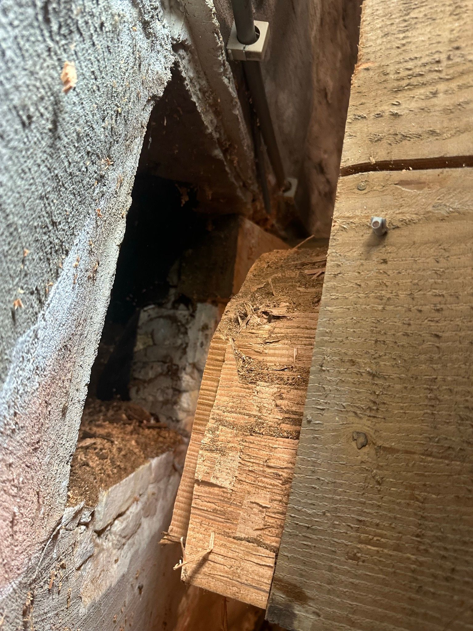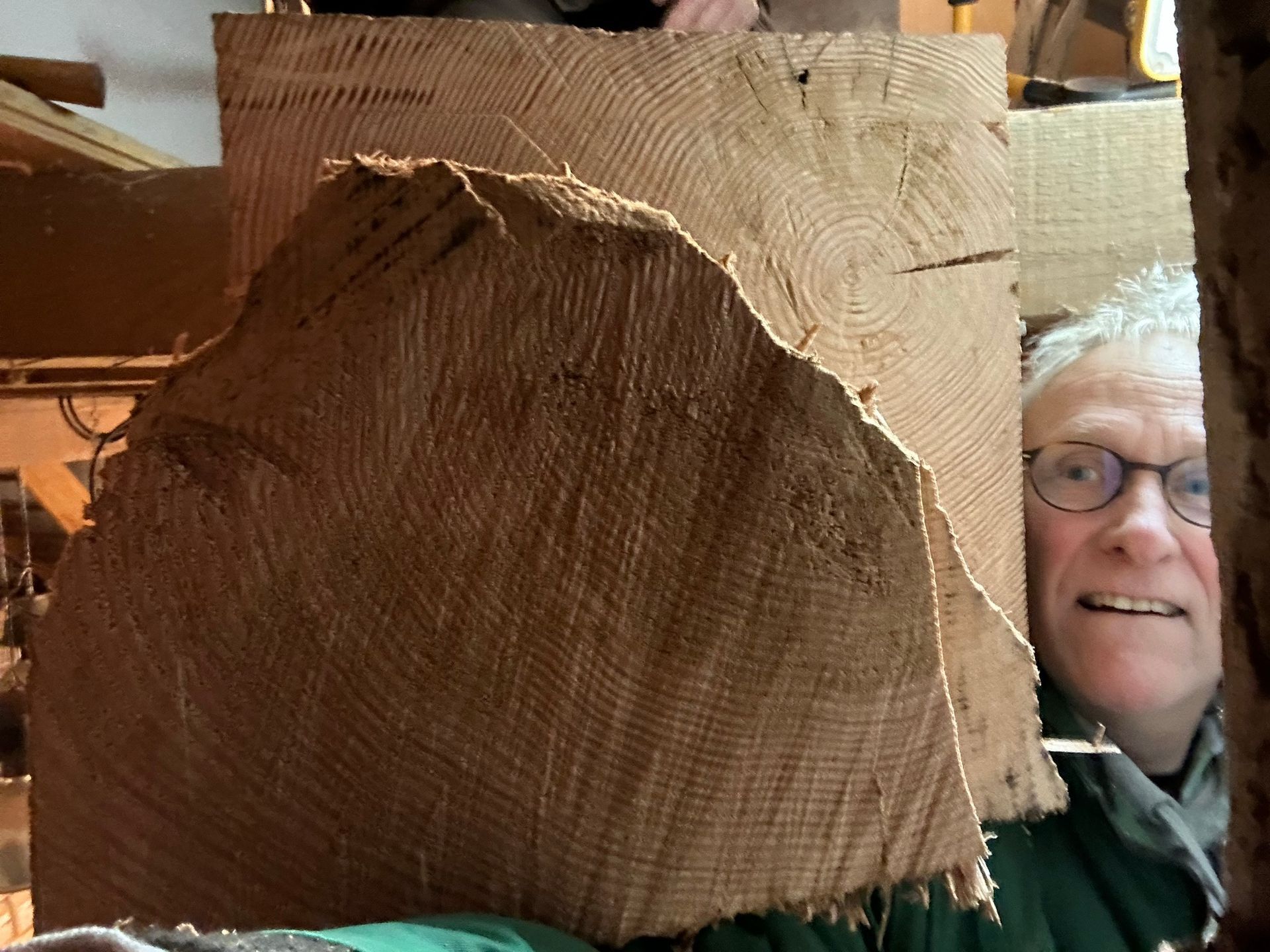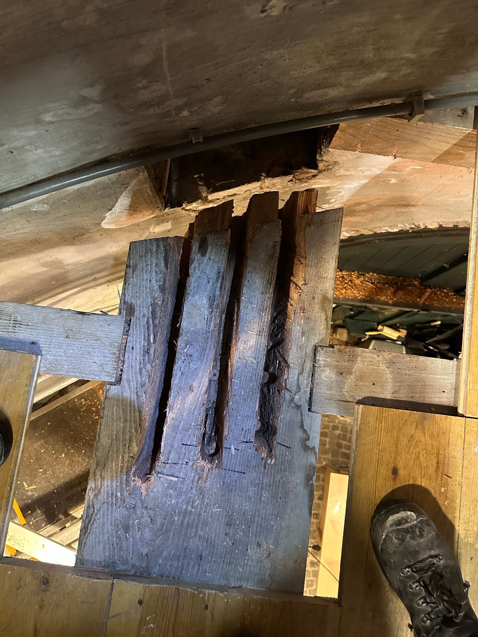 Tijdens de inspectie door de Monumentenwacht Noord-Brabant werd er een zachte plek geconstateerd in de kop van een draagbalk. Ofschoon er geen gevaar voor breuk was, is er voor de zekerheid besloten om deze kop met epoxy te repareren.