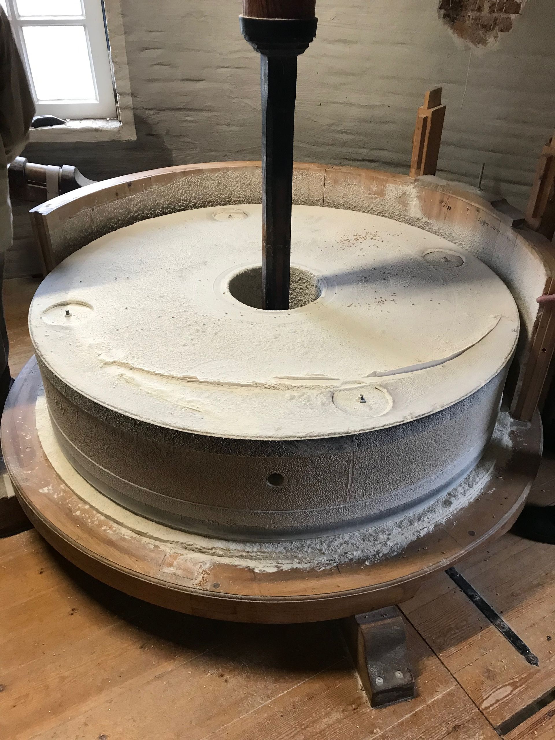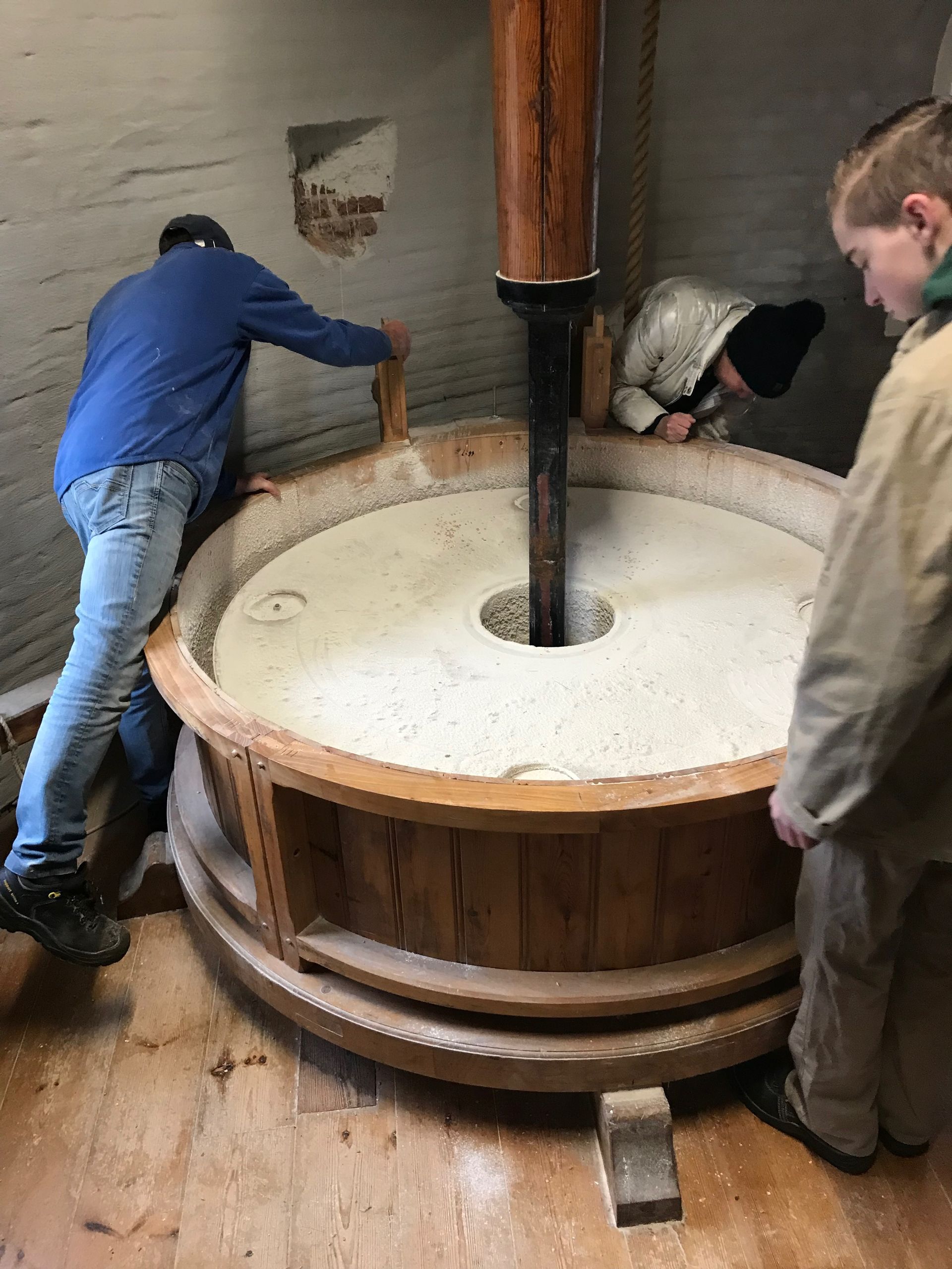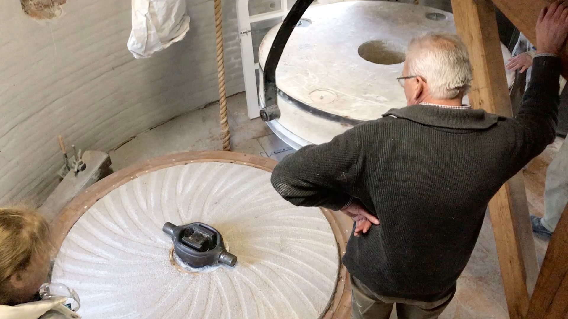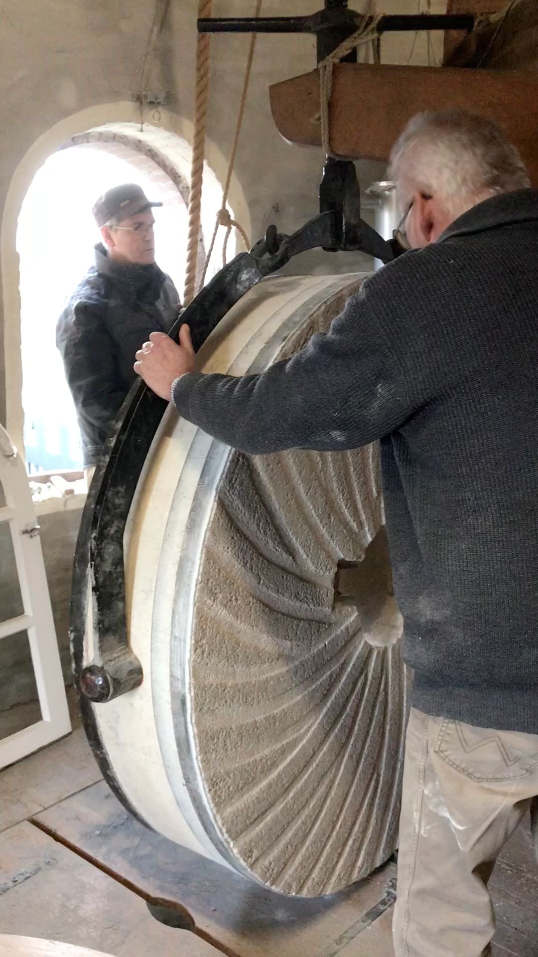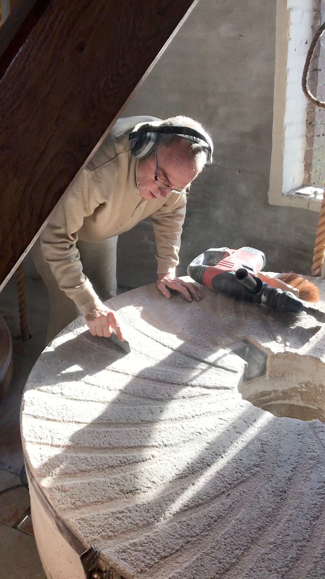 Molenstenen hebben regelmatig onderhoud nodig. De bloem die ontstaat tijdens het malen stuift nogal en gaat overal op en tussen zitten, meelmotjes vinden dat prettig. Maar ook slijten ze door het malen. En dat merk je aan het maalresultaat , het meel. De maalstenen moeten dan opnieuw "gebild" worden. In normale omstandigheden kunnen wij dit zelf, maar omdat de stenen opnieuw moesten worden afgesteld, hebben we een specialist laten komen.