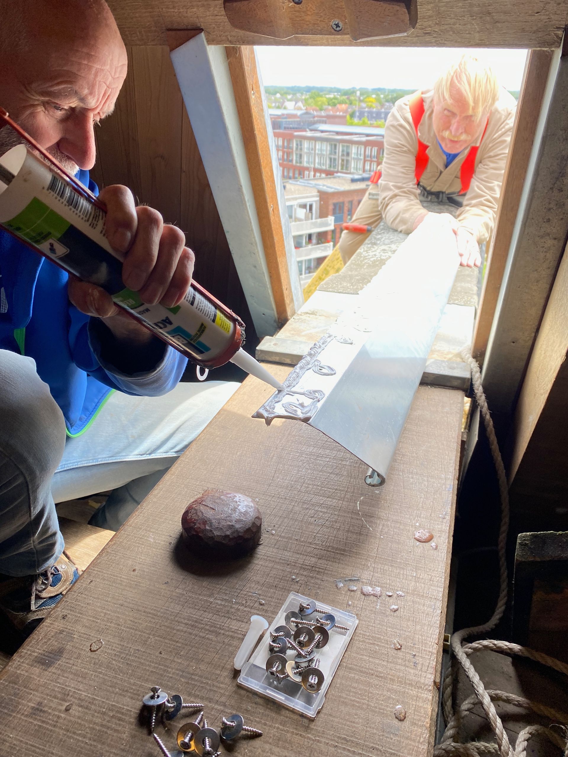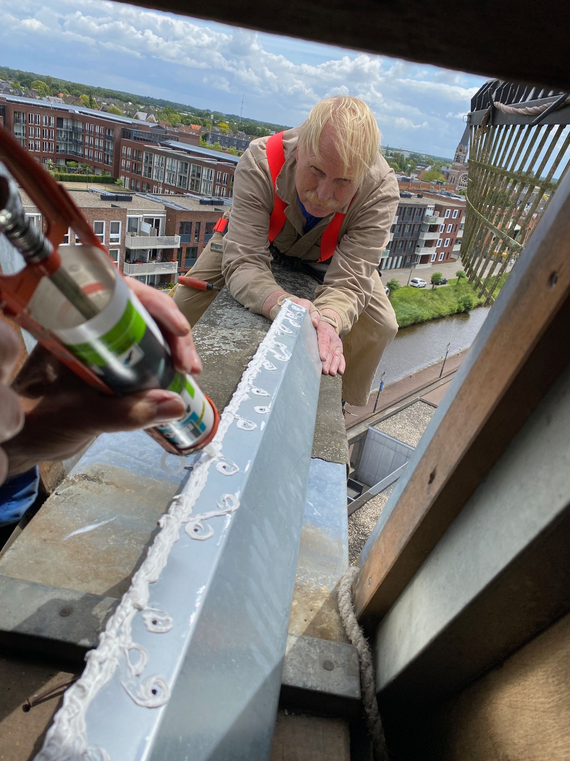 de lange spruit is de langste houten balk die dwars door de molenkap loopt en wordt gebruikt voor het kruien, oftewel het draaien van de kap. Door scheurvorming is water via capillaire werking de molen binnengekomen, met mogelijke schade aan kwetsbare onderdelen en hoge kosten tot gevolg. Met de installatie van dit gootje wordt het binnendringen van regenwater voorkomen en blijft de molen droog. Een eenvoudige maar doeltreffende maatregel.