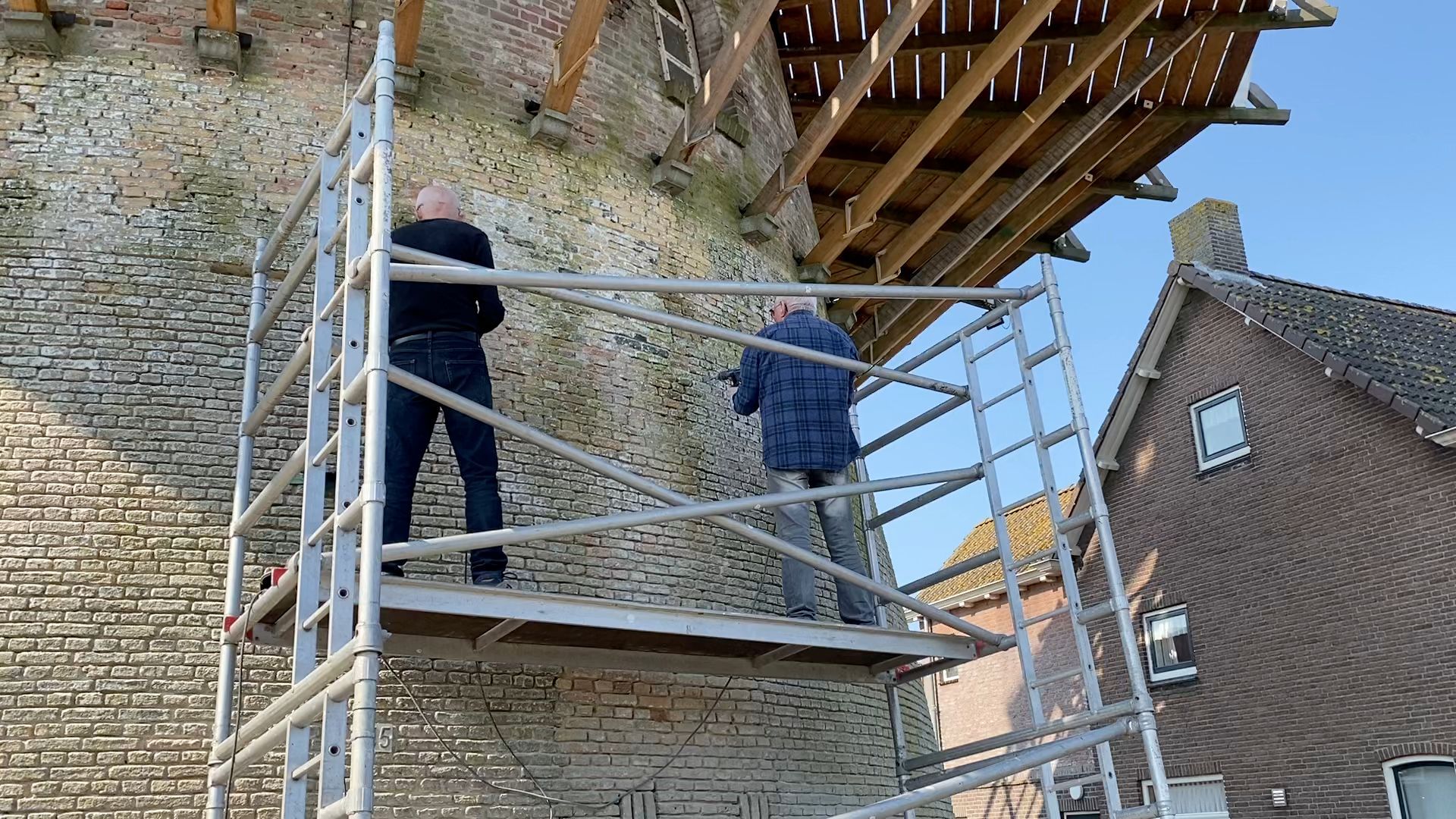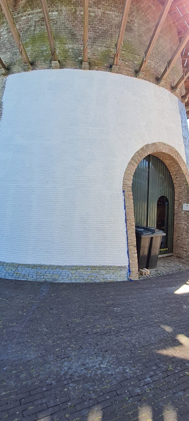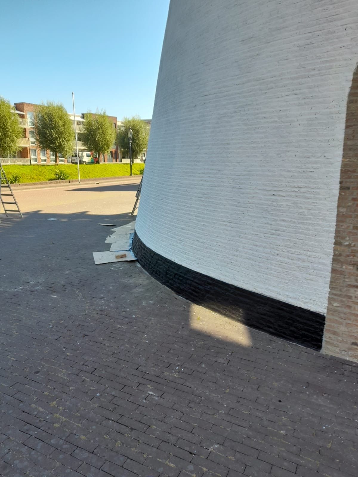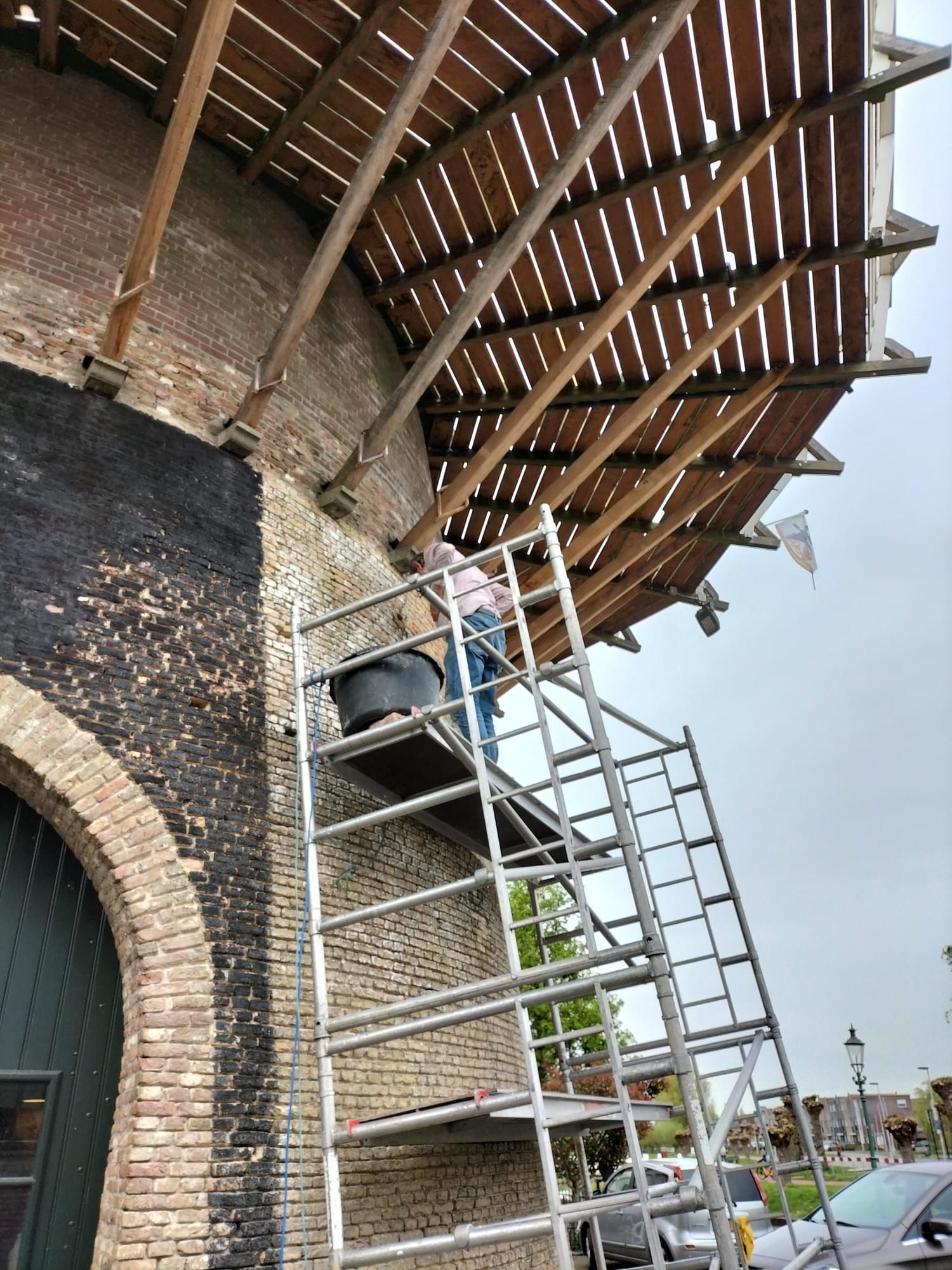 De oorspronkelijke molenromp uit 1801 heeft in het verleden vochtproblemen gekend a.g.v. verkeerde materiaalkeuze. Na het verwijderen van oude verflagen en dito voegen kon de muur weer ademen. Dit jaar hebben onze vrijwilligers opnieuw dit 220 jaar oude gedeelte gevoegd met mortel en aansluitend de romp met vochtwerende maar ademende verf behandeld. Al met al een enorme klus maar het resultaat mag er zijn. We rekenen op nog eens 220 jaar.